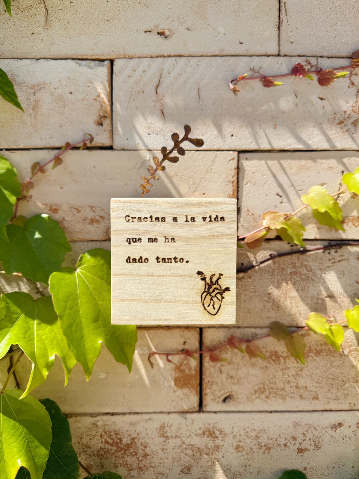 O Cubo – Gracias a la vida que me ha dado tanto é uma escultura em madeira e ferro que cabe em qualquer lugar — pequena no tamanho, mas imensa em significado. Inspirada na canção icônica de Violeta Parra, esta peça é um tributo à gratidão e à poesia da vida. Com a frase e um coração gravada na madeira de Pinus, simboliza a força de sentir, agradecer e estar presente. Cada cubo é feito artesanalmente, com o toque natural da madeira e a leve oxidação do ferro, tornando-se uma presença viva e afetiva nos espaços do lar.
