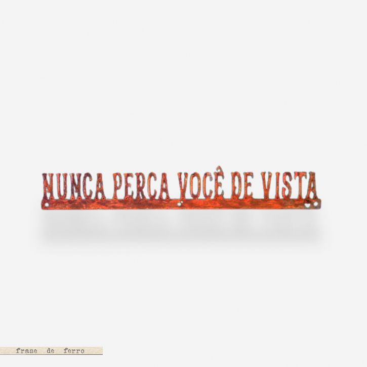 A frase "Nunca Perca você de vista" em ferro, com seu acabamento naturalmente envelhecido, traz um toque de sofisticação rústica e inspiração para qualquer ambiente, convidando à reflexão e à celebração da autonomia e da autenticidade.